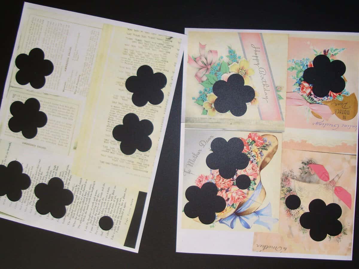 OK>> SO >> my solution to NOT actually punch out vintage cards and books…. I xeroxed pages from old books and xeroxed old cards and punched out those! 🙂