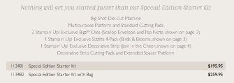 If you prefer to purchase the Starter Kit WITH the above kit contents PLUS the fabulous storage/transporting bag ($259.95), I will give you a $15.95 die of your choice FREE and you will also qualify for $25 additional FREE Merchandise AND a Level 1 Hostess set!
