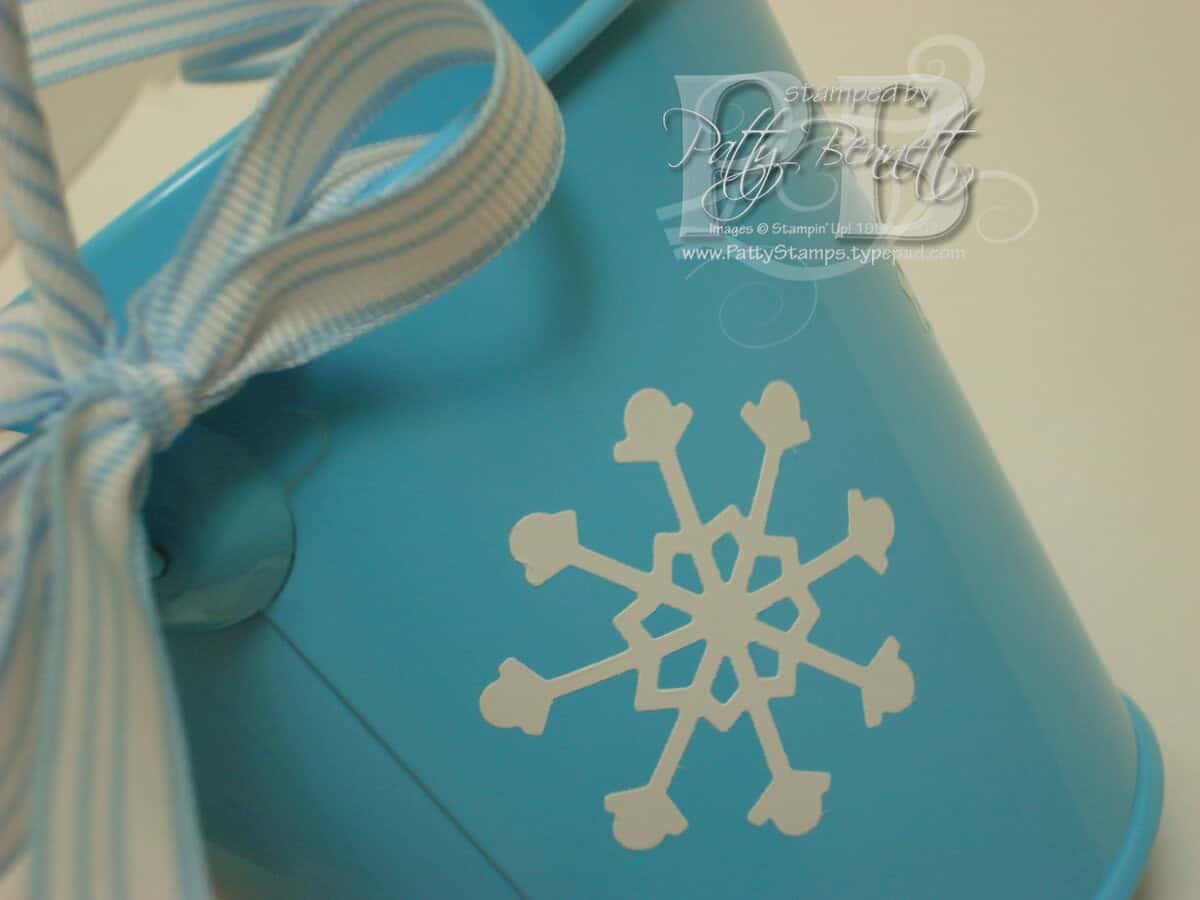 I used the Stampin' Up! Vinyl sheets to cut out the small Snowflake #2 sizzlits dies, and then stuck them on the tin!! :) Too fun, huh? It's just like making your own Decor Elements!! I added the Stampin' Up! Bashful Blue striped ribbon around the handle and tied bows at each end of the ribbon.