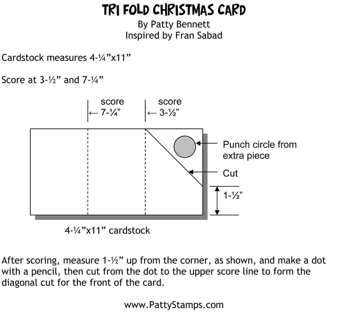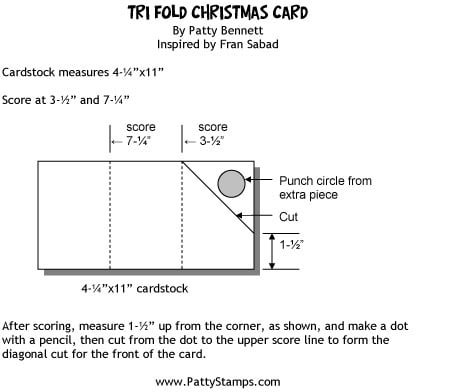 My version of this card is just a little smaller than Frans, and starts with a 1/2 sheet of cardstock, cut to 4-1/4"x11. It is scored and cut per the diagram below: