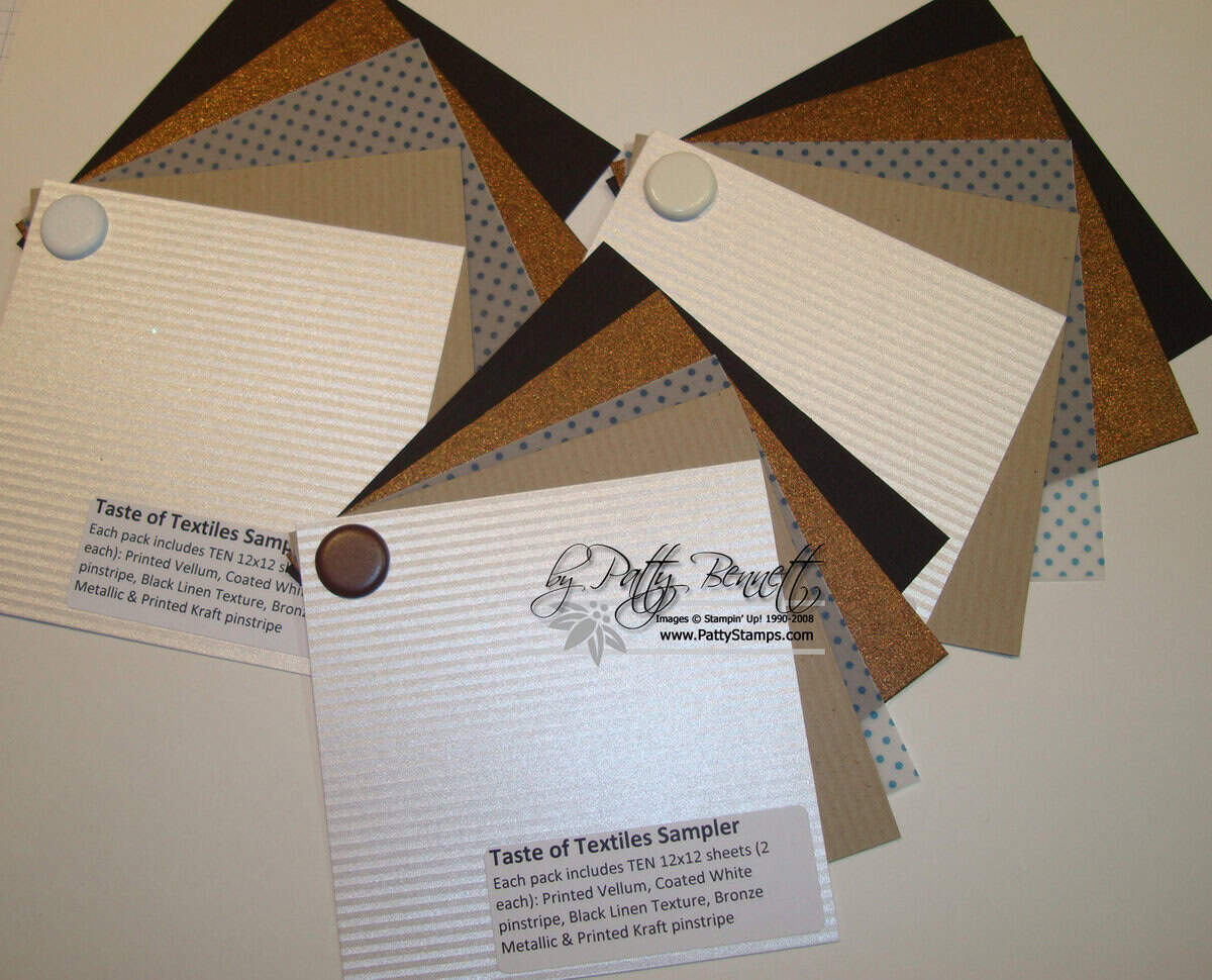 Make a sampler using the gorgeous Taste of Textiles Specialty Paper. (4×4 squares are in your meeting packet – get Jumbo Brad and label at M&T table). Item #113991, pg 256. Each pack includes TEN 12×12 sheets (2 each): Printed Vellum, Coated White pinstripe, Black Linen Texture, Bronze Metallic & Printed Kraft pinstripe