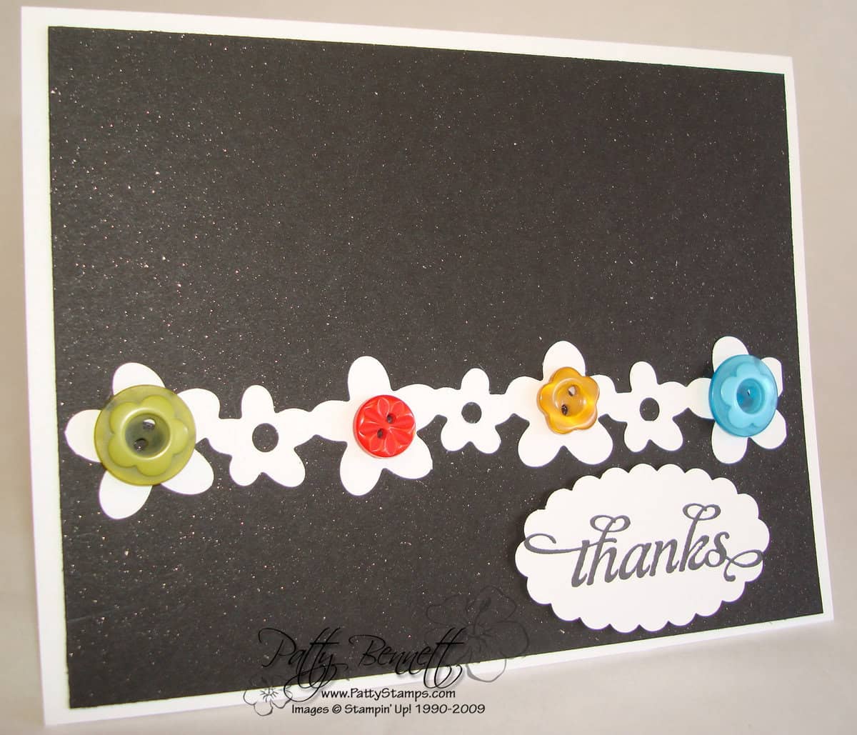 Card Above: Idea fom Connie Babbert. The white flowers are from the Flowers Sizzlit Decorative Strip die. We mixed some Champagne Shimmer Paint with rubbing alcohol in spray bottle and sprayed it onto the black cardstock for the pretty shimmery look. The Buttons are from the PLAYGROUND button assortment.