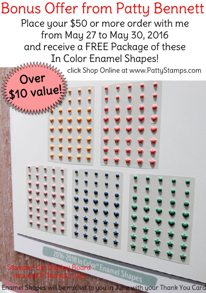 When you place a $50 or more Stampin' Up! order with me this weekend, I'll send you a free package of the new In Color Enamel Shapes in June when I mail your Thank You Card!