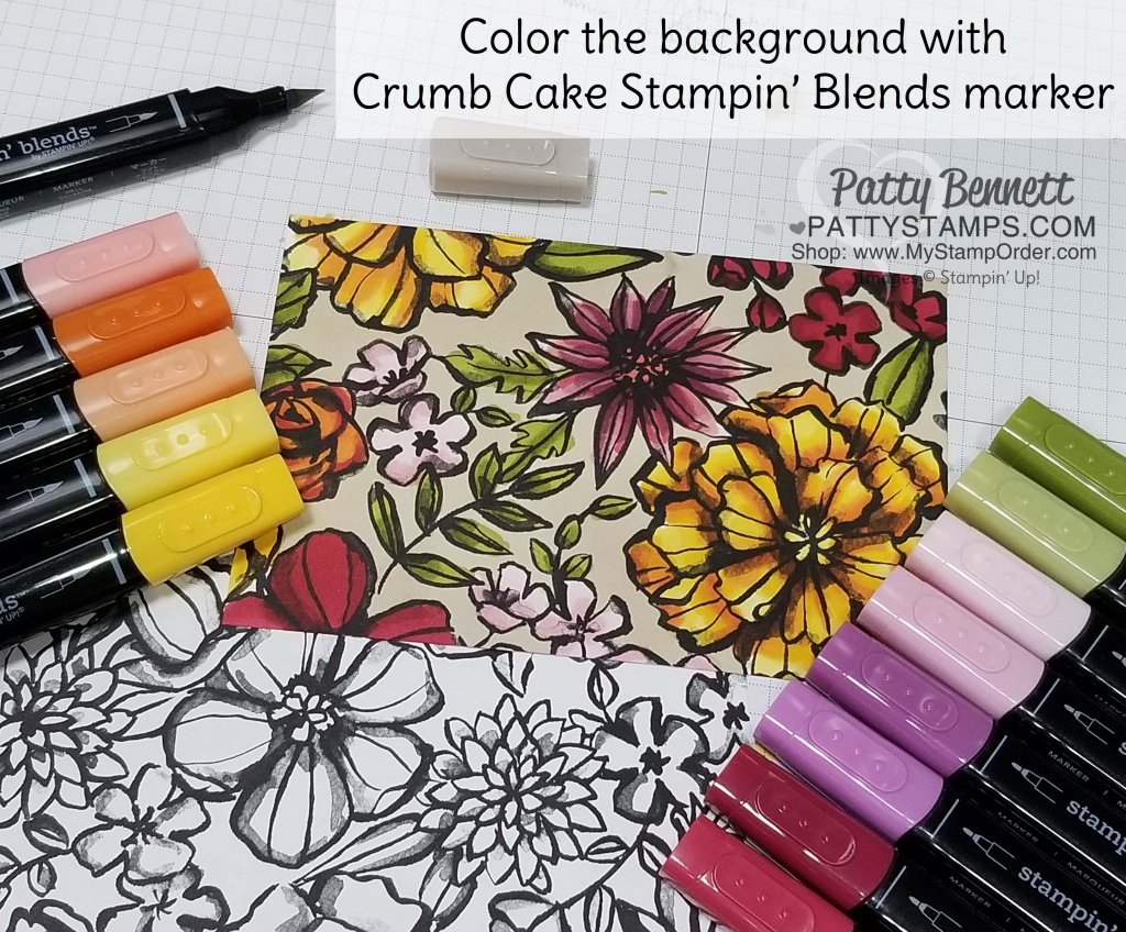 As I mentioned in my video tutorial above, I colored the background of one card with my Light Crumb Cake Stampin’ Blends marker. It just lends a completely different feel to this Petal Passion designer paper!